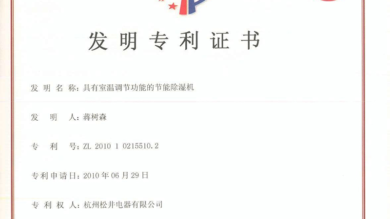 荣获国家室内调温功能节能除湿机发明专利